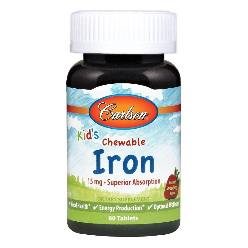 Kid's Chewable Iron 15mg Strawberry 60 tablets Carlson Labs is a dietary supplement designed to support children's blood health and energy levels. Each chewable tablet delivers 15 mg of iron in the form of iron glycinate chelate, known for its superior absorption and gentle effect on the stomach.