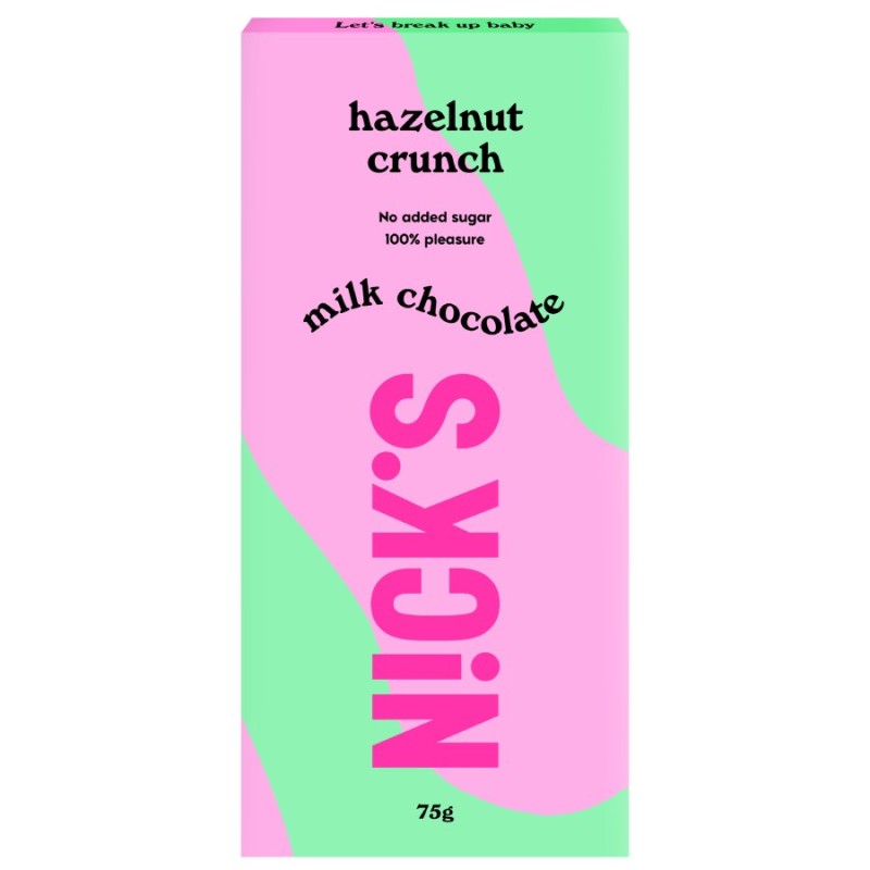 Milk Chocolate HAZELNUT CRUNCH No Sugar 75g NICK'S is a rich interior filled with hazelnut protein pulp, pulling caramel in a milk chocolate coating. It contains no palm oil, artificial preservatives or colors. In addition, it is suitable for people with gluten intolerance. It is characterized by a high protein content.