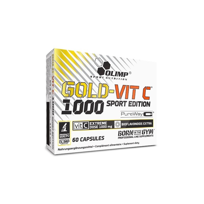 Gold-Vit C 1000 Sport Edition 60 kaps Olimp Nutrition to innowacyjny i bezpieczny suplement diety zawierający maksymalną dawkę witaminy C w opatentowanej formie PureWay-C. PureWay-C to witamina C w postaci kompleksu kwasu L-askorbinowego i bioflawonoidów cytrusowych. Witamina C odgrywa kilka ważnych ról w naszym organizmie.