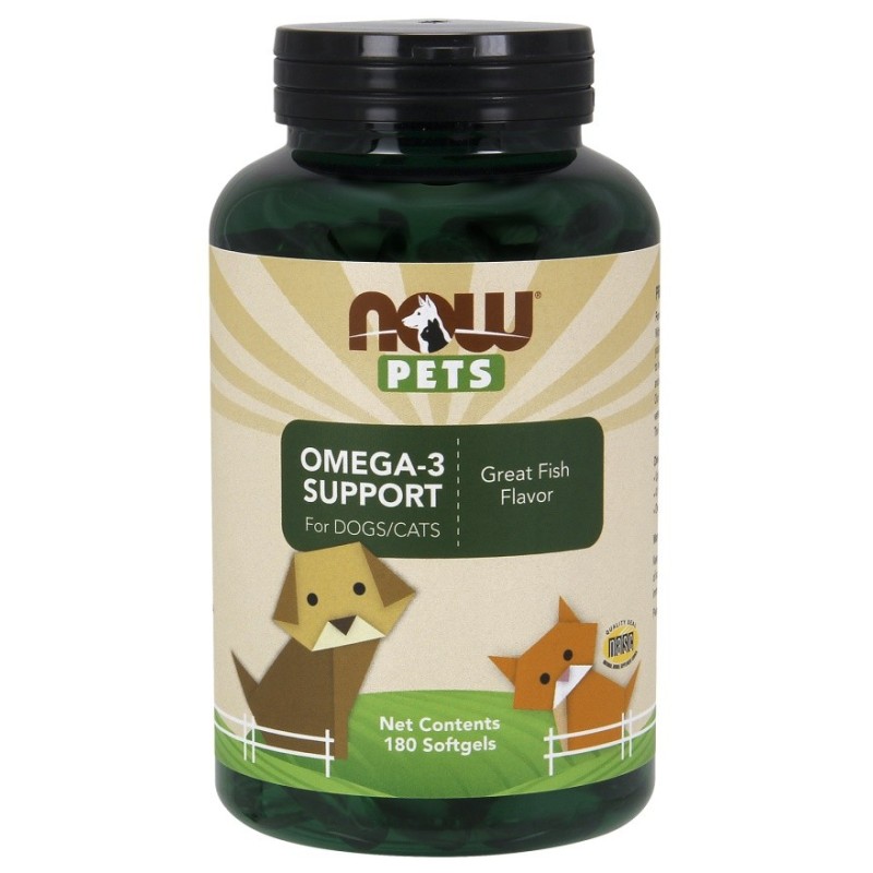 Pets Omega-3 Support 180 softgels NOW Foods is a dietary supplement designed to provide essential omega-3 fatty acids (EPA and DHA) to pets, supporting their overall health and well-being. It is formulated to help with skin, coat, joint, and cognitive health for both dogs and cats.